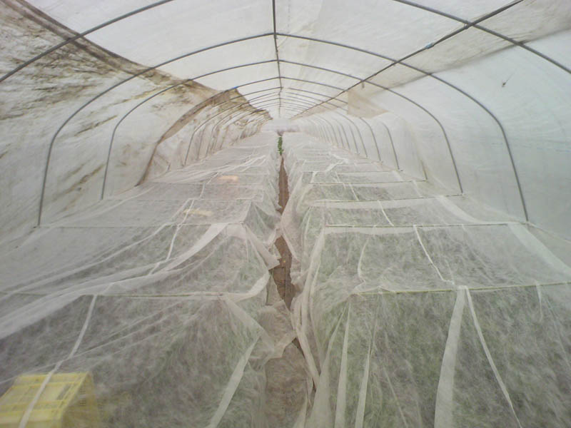 ハウスの構造は一番外側にビニールがあり、その内側にさらに家でいうカーテンがニラを覆っています。