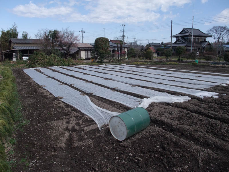 この時期は夜の寒さでニラがだめにならないように、パウパーと呼ばれる布をかぶせます。