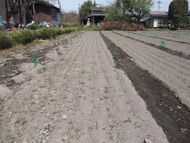 ニラは芽が出立てのころは非常に細いので、写真ではわかりにくいかもしれませんが、遠くのほうを見ると、なにやら縞模様のようになっているのがわかると思います。