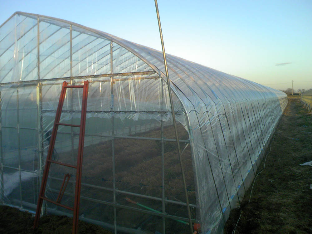 ニラのハウスを作るためにパイプだけのハウスの前面にビニールをかけます。